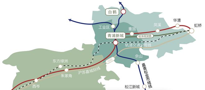 市域铁路:未来市域铁路嘉青松金线,将贯穿嘉定、青浦、松江和金山,届时白鹤将与青浦新城直接连通,并换乘轨交17号线和沪苏嘉城际线。
